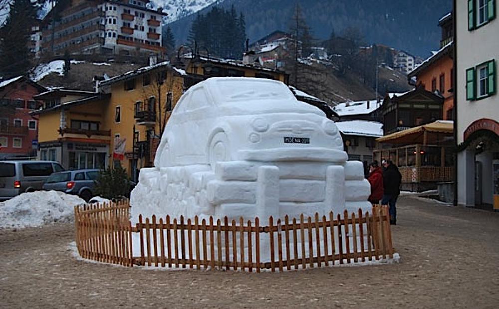 Da un grande blocco di neve ghiacciata alla forma di un'automobile. Un esempio dell'arte di Sandro Scalet