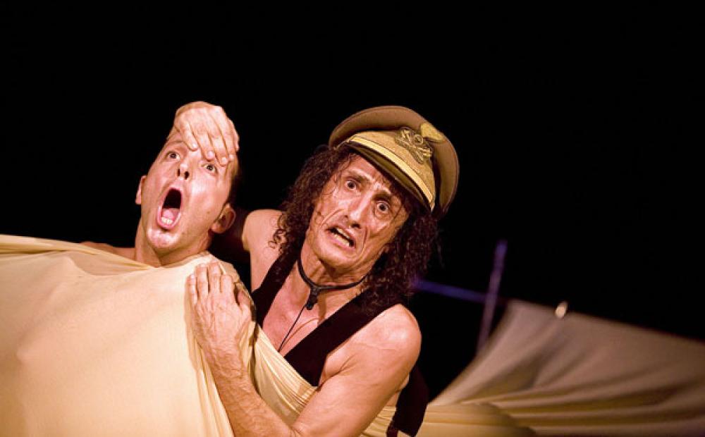Un attore e autore unico, che ha fatto dell’arte del riso una girandola continua, furiosa e irriverente, astratta e rivoluzionaria, in una parola geniale! Tra fasci di tessuto leggeri come foglie e fortini dai quali sferrare l’attacco alle convenzioni teatrali, la scena creata da Flavia Mastrella rivela vizi e virtù di un popolo. Le miserie umane diventano comicità folgorante e forsennatamente ridicole.