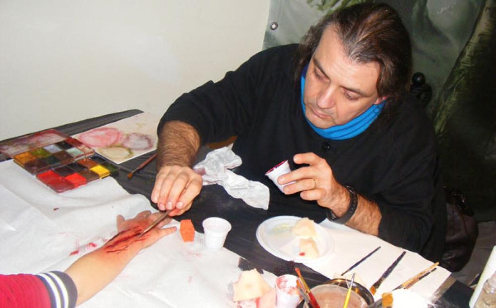 Il maestro truccatore Roberto Mestroni alla sua postazione delle "ferite da dinosauro" (foto Alessandro Tich)