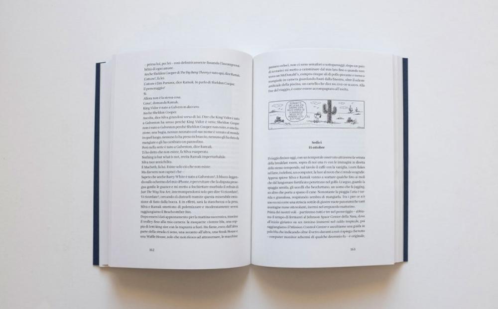Che il tempo del viaggio occupi in realtà due settimane, dal primo al quindici ottobre, è un dettaglio che può interessare a chi desideri seguirne col polpastrello le impronte sulla cartina a quattro facciate, in fondo al volume, facendo del libro una guida documentata e aggiornata da scaffale. Vale per chi si accinga a pedinare questo pellegrinaggio a tema di ottomila chilometri negli Stati Uniti, sosta per sosta, nello spazio fisico, geografico, fatto di coordinate e traiettorie puntuali, che ha intrapreso: partendo da Los Angeles, il territorio che nei primi del ‘900 ospitava l’insediamento della comune utopica di Llano del Rio la prima tappa – inevasa – il Johnson Space Centre della Nasa a Houston l’ultima; nel mezzo apparizioni e spettri di uomini, luoghi e città che ancora “sono”, e che hanno molto da raccontare. Ma se l’itinerario si snoda seguendo l’incanto delle indicazioni di un cartello giallo, che reca scritto Absolutely nothing – next 22 miles, le categorie troppo umane di tempo e spazio diventano inutilizzabili, fossili, “da alienare”.