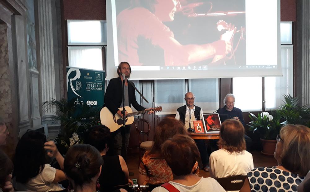 Sabato 15 giugno, a inaugurare la terza la giornata di “Resistere” è tornata la musica. A Palazzo Roberti si è voluto ricordare un momento importante come la ricorrenza dei vent’anni dalla scomparsa di Fabrizio De André con un appuntamento a tre voci dedicato al grande cantautore italiano e sottotitolato “Di sguardi randagi e cattive strade”. Ospiti dell’incontro sono stati il celebre fotografo e giornalista musicale Guido Harari, che ha dedicato a De André numerosi libri, tra i quali quello che ha dato il titolo all’incontro, edito da Mondadori; poi Giulio Casale, cantautore, autore e interprete di spettacoli di teatro-canzone ed esperto della poetica di De André, raccontata anche nello spettacolo "Le cattive strade", assieme ad Andrea Scanzi; infine il critico musicale Gio’ Alajmo, che ha conosciuto e frequentato Fabrizio De André.