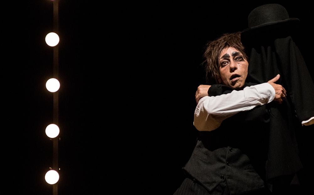 Sul palco, un camerino/scena da varietà con una porta/specchio di Alice illuminata da cui entra e esce e si inquadra da sola la Scimmia, questo animale-uomo che racconta agli esimi membri dell’Accademia la sua storia, la sua poco naturale evoluzione, come nel testo di Kafka. La Scimmia indossa un’altra maschera, oltre a quella che si è infilata per sopravvivere nel mondo umano, cioè il costume di Charlot; si muove e si agita in una gabbia dalle sbarre trasparenti che sente solo lei un po’ con la camminata di Chaplin e un po’ con movenze da primate (alla costruzione dei movimenti scenici ha collaborato Michele Bazzana).