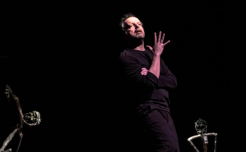 L’epoca del “tramonto dei padri”, come la definisce Recalcati, dove ciò che irrompe nelle nuove narrazioni non è “il padre”, ma la mancanza del padre, è impersonata sul palco da tre uomini-genitori italiani che abitano lo stesso condominio, primo, secondo e terzo piano senza criteri dimostrativi d’altro; una trinità variegata rispetto a cultura, estrazione sociale, ruolo lavorativo e provenienza geografica d’origine, interpretata in un monologo articolato a più voci e in più panni da Perrotta. Sul fondale nero, tre sculture scheletriche che rappresentano figure classiche (il discobolo, il pensatore e un guerriero ferito/prostrato).