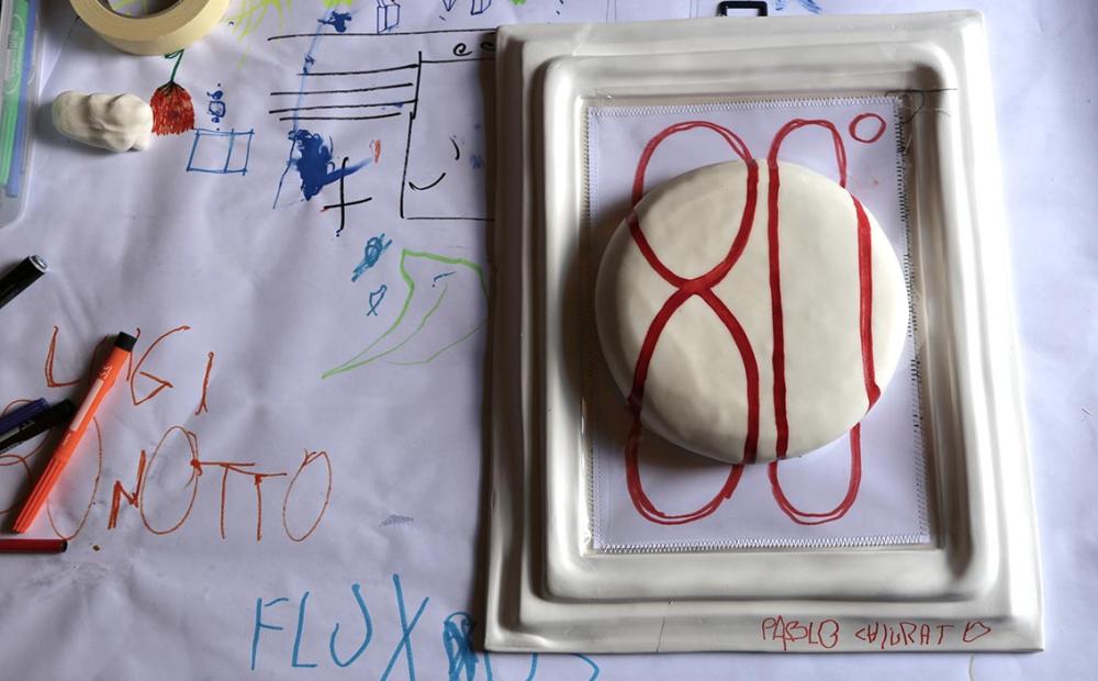 Il piccolo Pablo Chiurato di soli 4 anni, ha voluto omaggiare il compleanno di Luigi realizzando la torta che interpreta l'opera di Dick Higgins, poeta e compositore statunitense del movimento Fluxus. E chissà che la torta del piccolo Pablo non dia inizio al nuovo movimento dei dolci Fluxus.