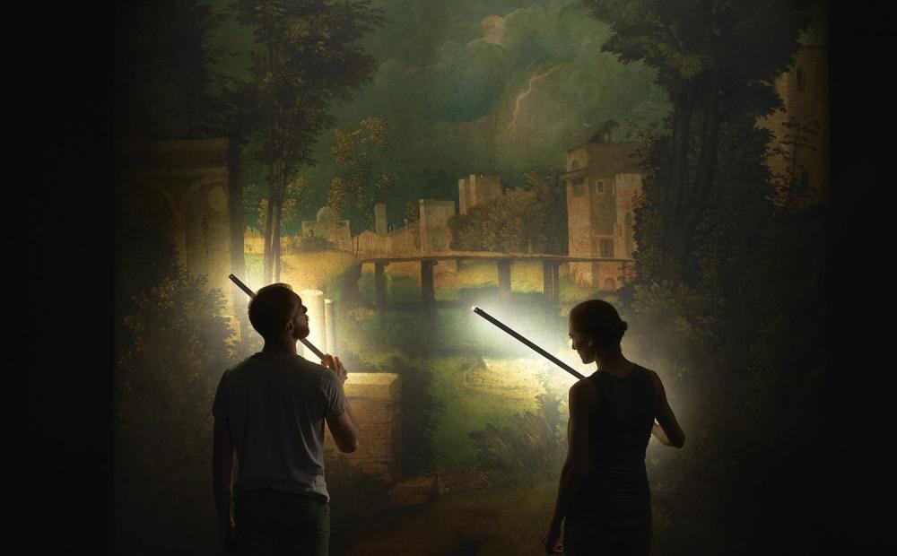 L’inizio dello spettacolo è annunciato da luci a effetto stroboscopico e dalla voce di Luca Altavilla che interpreta con la giusta follia più che liturgica da predicatore di una setta Recitativo veneziano, opera commissionata da Fellini a Zanzotto per il suo Casanova. Lo stacco con la prima scena all’apertura del sipario è netta. Due figure si stagliano nell’ombra, quasi in una grotta nativa i moderni Adamo ed Eva sostano davanti a un pannello che riproduce La tempesta, di Giorgione, opera cara nella drammaturgia di Anagoor. Stanno come davanti a una finestra che inquadra un paesaggio da Eden perduto. Manca la presenza umana nella riproduzione del dipinto, e non c’è la figura di donna col bambino che ricomparirà in vesti umane solo al termine dello spettacolo.