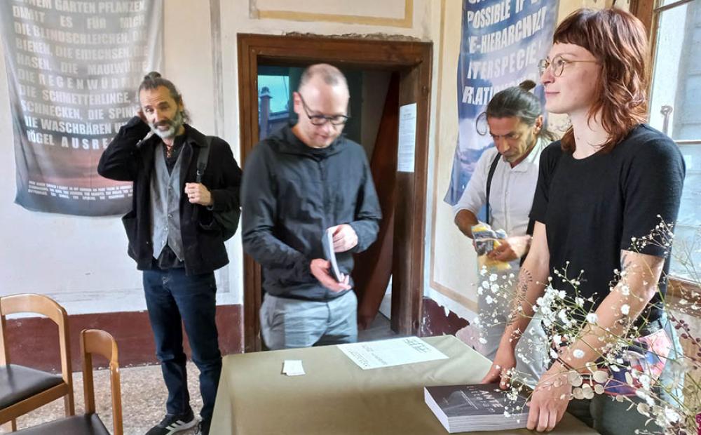 Gino Blanc, artista e “pensatore visivo” veneziano, ha realizzato due oli cupi situati nella cappella della Villa, in essi si raffigura in modo poetico, per antinomie, lo stato di precarietà di un presente doloroso. Accanto, un video racconta la performance dedicata a Bartleby lo scrivano che vede protagonista l’artista tedesca Sandra Hauser con Don, il suo cavallo bardato di luci, colui a cui è demandata l’ultima decisione in merito alla performance, che ha da essere o non essere, e non è un problema (iwouldprefernotto.org). Altri animali, volti da epigrafe di maiali uccisi nel rifugio di Sairano nel 2023, li troviamo nel sacrario di Tiziana Pers (Hands off sanctuaries), sono appesi in un corridoio a budello e fanno venire in mente atmosfere da Pink Floyd.