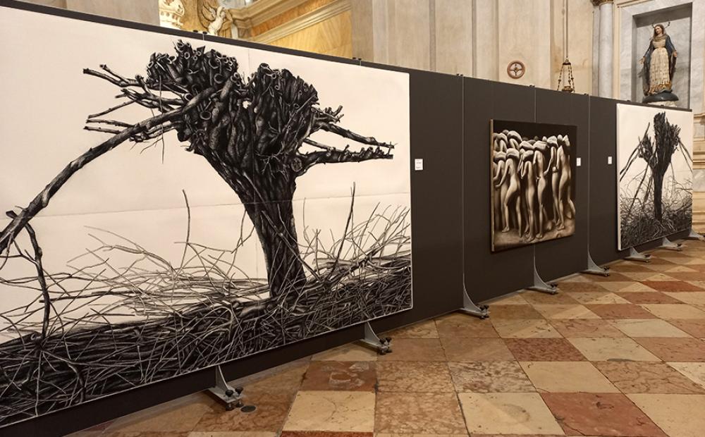 Dal figurativo che sfocia nel sacro degli enormi alberi potati realizzati al carboncino e poi dei giardini di Silvano Tessarollo, a inneggiare a una natura madre generosa, al sacro incarnato nei volti-ritratto di Beati, in omaggio alla potenza generatrice di uomini di chiesa, nella culla del territorio – inframezzati da una trasgressiva “Pietà” di Saturno Buttò; da paesaggi a matita che poi prendono colore abitati da casali in rovina che si profilano nelle campagne, a cura di Luciano Baldacci, al fasto monocromo, cupo nella Salute, di Venezia, dipinta da Tommaso Ottieri; da quadri dove a regnare come soggetti sono l’operosità e l’agire di mani, come nell’opera di Manuel Pablo Pace “Ieri, oggi, domani”, realizzata su juta, alla presenza di animali da soma ritratti con la dolcezza di una preghiera, come nelle opere di Marco Bettio; e poi scene evocanti sofferenze, dolore e guerre, una su tutte il volto urlante dipinto da Santiago Ydáñez, e stranianti ritratti di famiglia resi dolcemente spettrali, alla Ensor, di Nebojša Despotović.