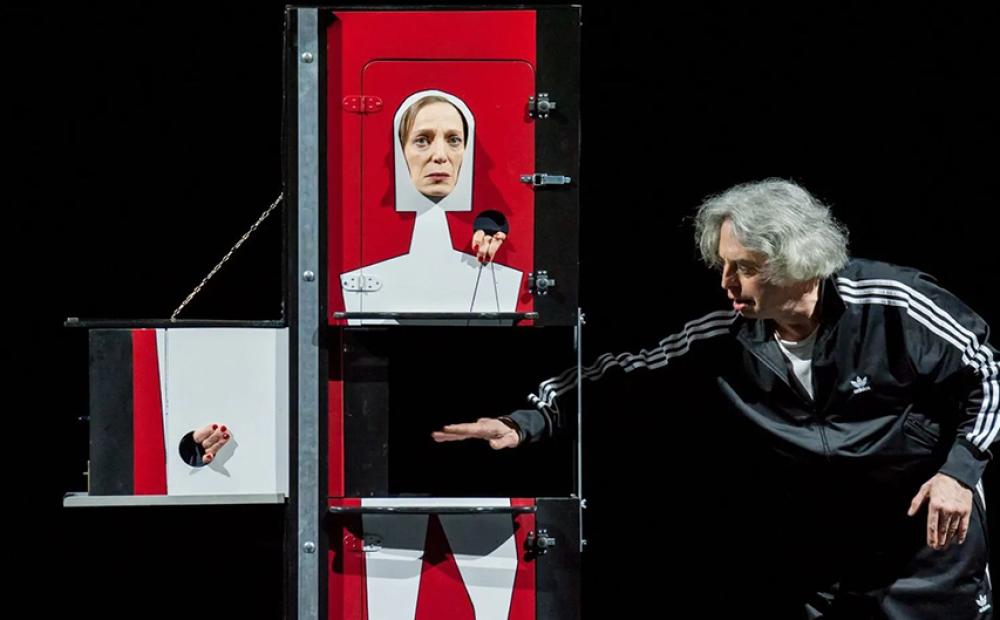 La donna in rosso (Emanuela Villagrossi) si muove lenta, elegante, eterea, mentre l’uomo che la chiama è in tuta da ginnastica (nera, a lutto), è nel caos dei giorni del tutto terreno e prova a capire a tentoni, sottraendosi alle leggi della quotidianità, che forma si possa dare al dolore che prova.