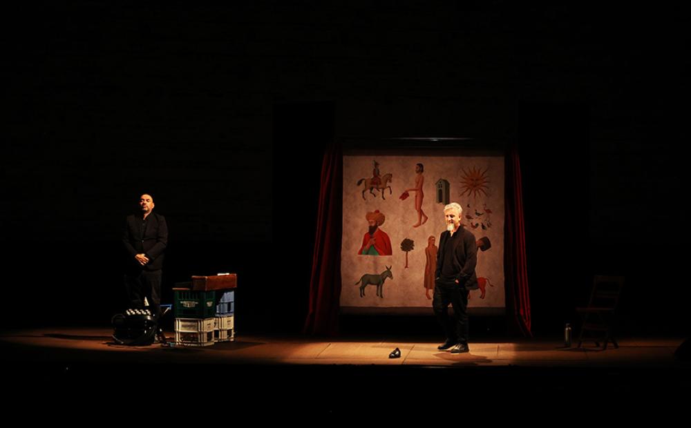 Il palco del teatro è nudo, quasi povero e quasi buio. Le mura millenarie del Castello ben si intonano a fare da sfondo. La scenografia rievoca certe piazzette da paesello, che contengono un intero mondo. Un sipario rosso custodisce un pannello luminoso con immagini realizzate di Franco Biagioni, nient’altro poi che una sedia di legno e quattro casse di plastica di quelle da bibite a reggere una tastiera. Da un lato, il musicista Gianluca Casadei, con la fisarmonica al collo; dall’altro, Celestini, a costruire con maestria un paesaggio fatto di parole, pause, piccoli gesti.