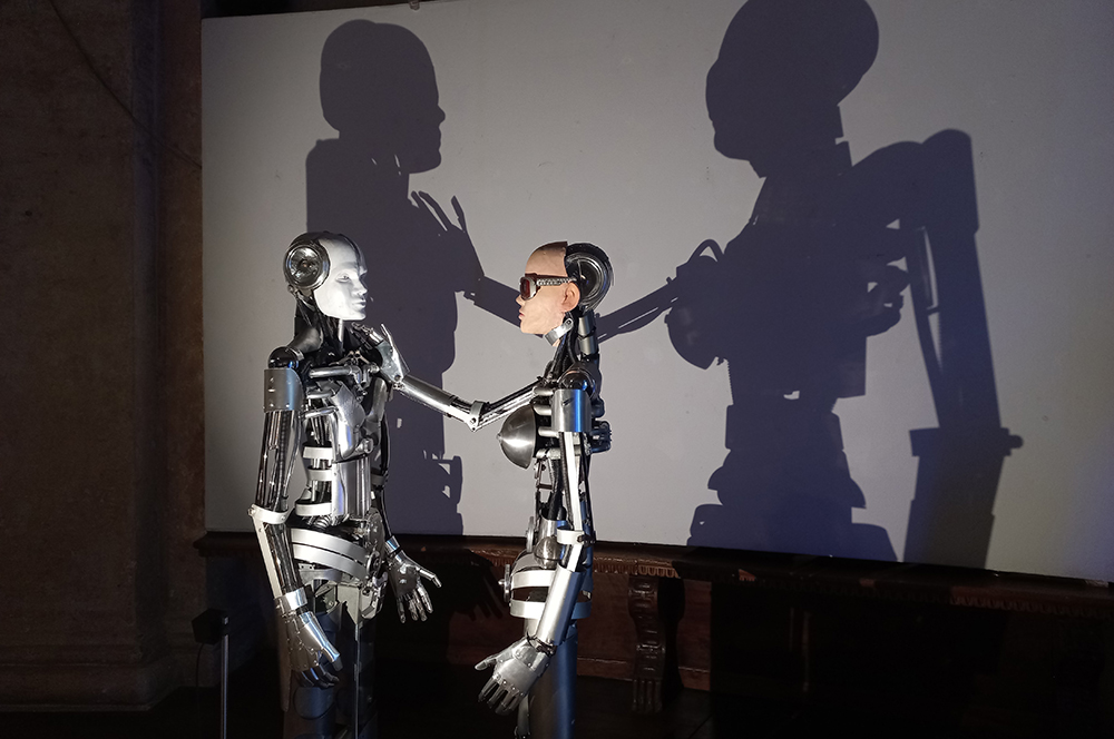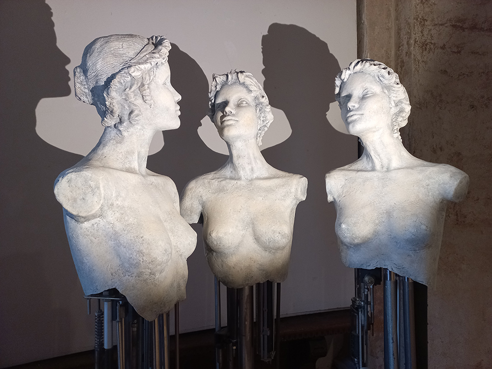 Nei dintorni, altre opere con aspetto “umanico” realizzate in terracotta dipinta, materiali sintetici e parti metalliche evocanti elementi classicheggianti e immaginario di matrice letteraria, o cinematografica, o il mondo dei fumetti. Torso e ali d’acciaio per una Nike targata 3423; una coppia di umanoidi alla Philip Dick, maschio e femmina, che si accarezzano dolcemente; un trio di dee-muse (476) le cui ombre si stagliano su pannelli bianchi; crani con il cervello scoperto intenti a interagire con congegni futuristici, o neanche tanto.