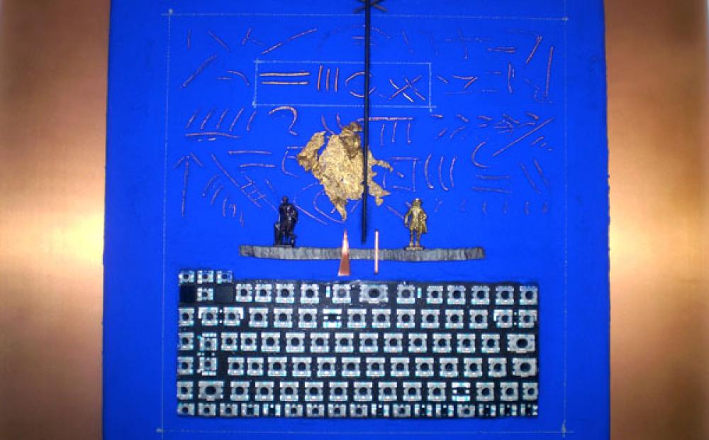 Infine, in “Comunicazione” (polimaterico ed acrilico su tela fissato su pannello in rame trattato, 2010) la composizione degli elementi passa dal graffito alla tastiera di un pc, sovrastata dai simboli della meridiana e del linguaggio scritto, su un campo blu oltremare che richiama il colore della contemplazione, con il corredo di due statuette rappresentanti due momenti cruciali per il pensiero occidentale: il diritto romano e l'illuminismo.