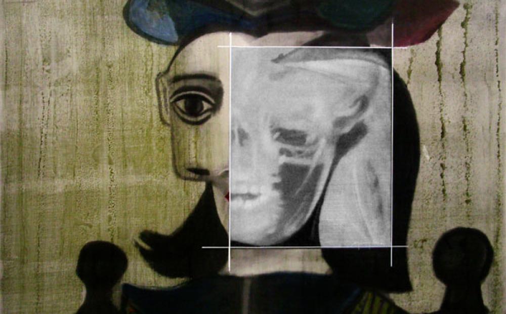 Con la sua incursione nel cuore della pittura, penetrando nei colori e nelle forme simbolo di vita e di bellezza, Meneghetti si trasforma in anatomista per rivelare, attraverso lo studiato inserimento di tasselli radiografici, lo scheletro nascosto della Monnalisa o della sempre leonardesca Dama con l'ermellino, dei volti di Modì, o delle “Demoiselles d'Avignon” di Picasso. E così, nella stessa tela, il caldo e rassicurante colore della pittura impallidisce e lascia spazio - quasi come un corto circuito - all'azzurro vuoto, inquietante e inespressivo, della lastra radiografica.