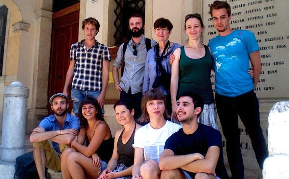 I nove protagonisti del Progetto Choreoroam 2011. In piedi, al centro, la "tutor" artistica del gruppo Rosemary Butcher (foto Alessandro Tich)
