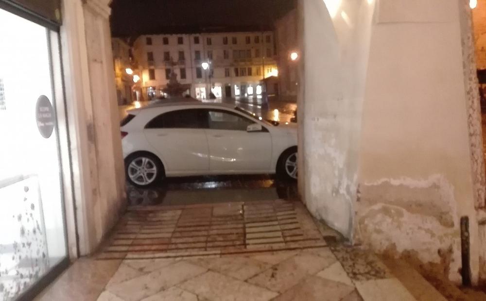 Non c'è uno senza due. Dopo il mio cliccatissimo editoriale di qualche giorno fa “Lost in ZTL”, mi tocca scrivere un secondo capitolo di quella che potrebbe profilarsi come una nuova serie intitolata “Quello che mi capita di vedere quando alla sera esco da Bassanonet”. E quello che mi è capitato di vedere, ieri sera alle 21 circa, lo vedete anche voi nella foto pubblicata sopra. Un'autovettura Mercedes A 200 bianca bellamente e tranquillamente parcheggiata in tutta la sua interezza proprio davanti allo sbocco su piazza Garibaldi del sottoportico di via S. Bassiano. Di lì devono passare i pedoni? Ecchissenefrega. Per carità: in qualche modo, volteggiando come Carolina Kostner e serpeggiando davanti al muso o dietro al culo dell'automezzo, i pedoni con gli ombrelli aperti per la pioggia dal sottoportico in piazza ci entravano. E poi, che diamine: c'era tutto il resto di via S. Bassiano libero al passaggio, cosa volete che sia.