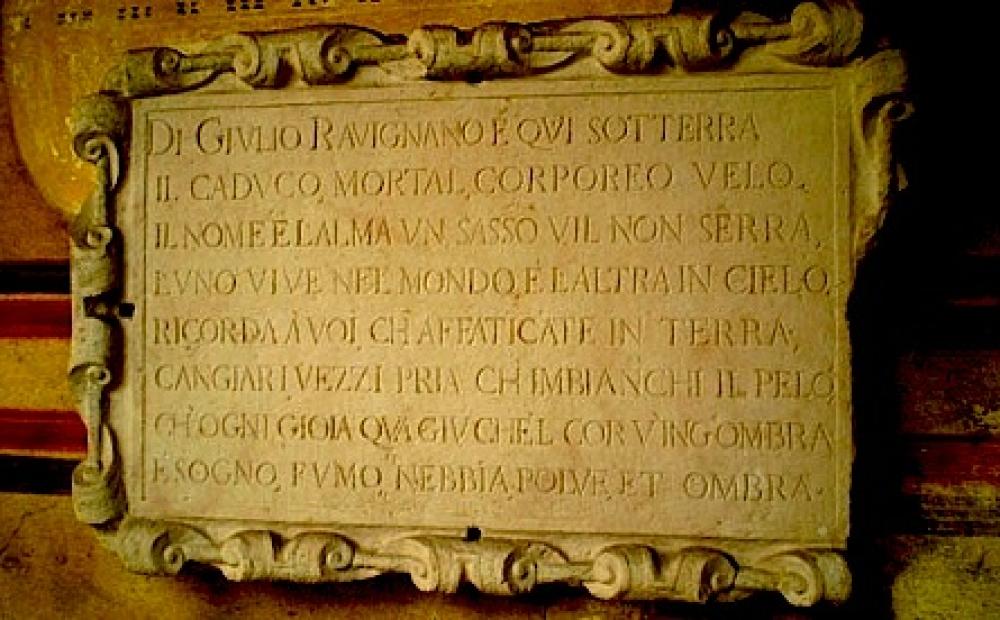 E' la pietra tombale che copriva il sepolcro di tal Giulio Ravignani. Non è specificato chi fosse quest'uomo né tantomeno l'epoca in cui visse, ma una targhetta affissa un po' più sotto ci dice che quella lapide si trova lì, al museo di Bassano, dal 1904.