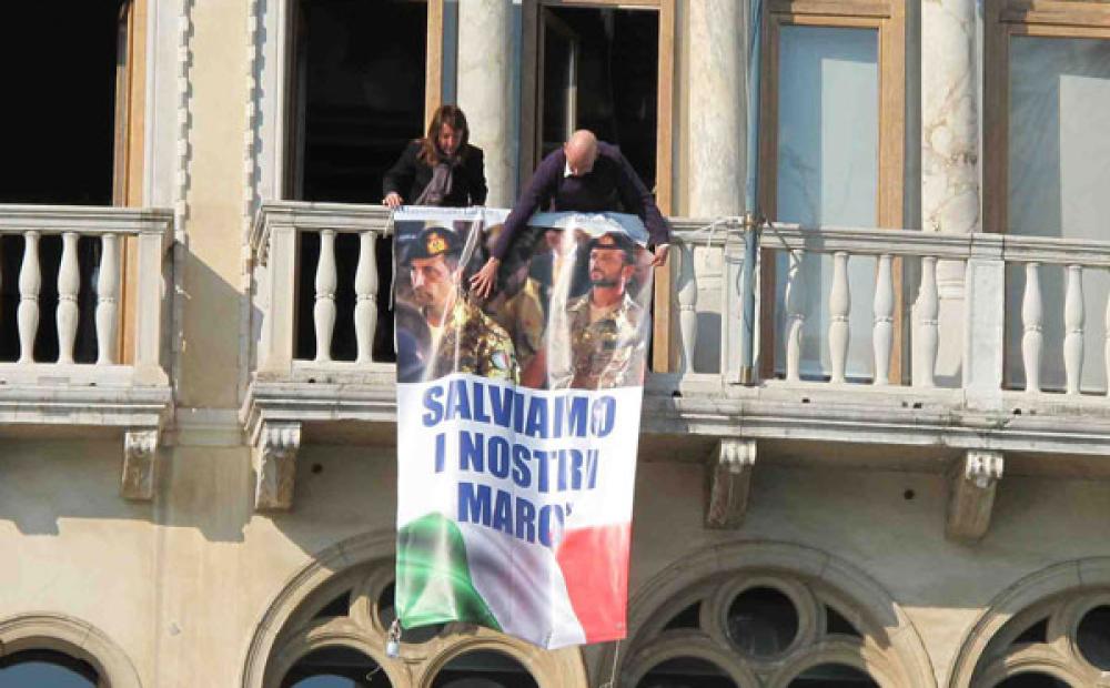 I due esponenti del Popolo della Libertà hanno srotolato da uno dei poggioli del palazzo che si affacciano sul Canal Grande, di fronte alla Chiesa della Madonna della Salute, uno striscione che chiede la liberazione di Massimiliano Latorre e Salvatore Girone, i due fucilieri del reggimento San Marco della Marina Militare (il primo tarantino, il secondo barese), trattenuti in India da circa dieci giorni con l’accusa di aver ucciso due pescatori indiani dopo averli scambiati per pirati che stavano per assaltare una nave mercantile italiana.