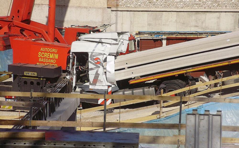 Tragedia sul lavoro questa mattina nel cantiere della fondazione Pirani-Cremona in vicolo Da Ponte a Bassano. Un camion si schianta sulla base della gru: muore uno dei due autisti, schiacciato dai profilati di cemento che stava trasportando