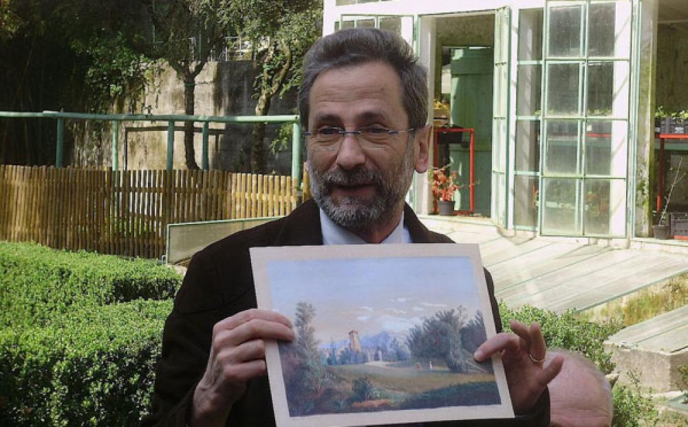 Il prof. Giuseppe Busnardo mostra in anteprima la riproduzione del dipinto della figlia di Alberto Parolini che raffigura il Giardino alle sue origini (foto Alessandro Tich)