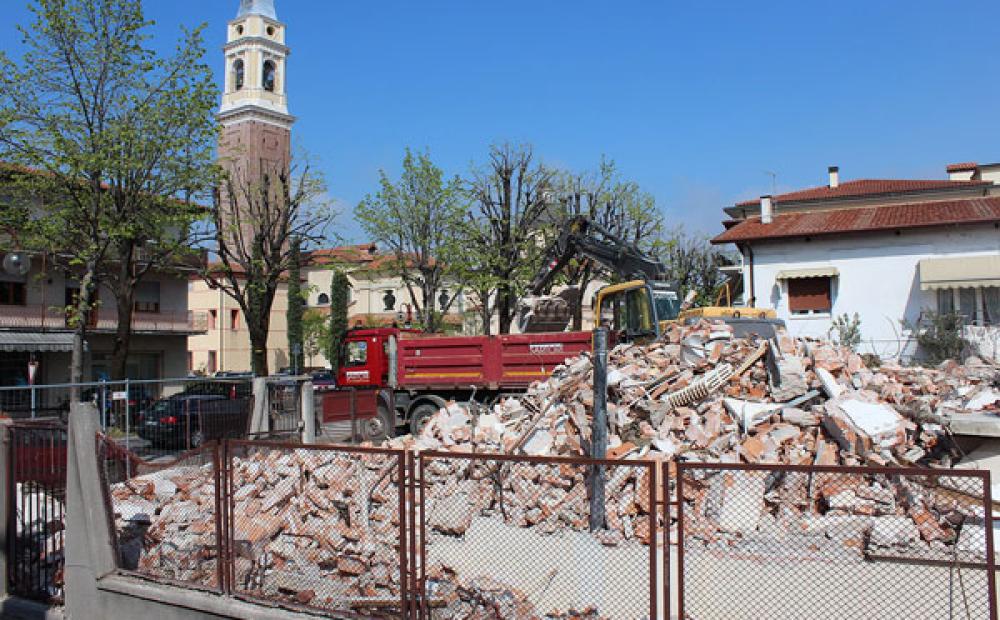 L'abbattimento del vecchio edificio per dare spazio a un parcheggio divide i commenti. Il sindaco Lanzarin: "Una scelta precisa a servizio della comunità". Il candidato sindaco di Ros@' 2012 Alfio Piotto: "Profondo dispiacere e perplessità"