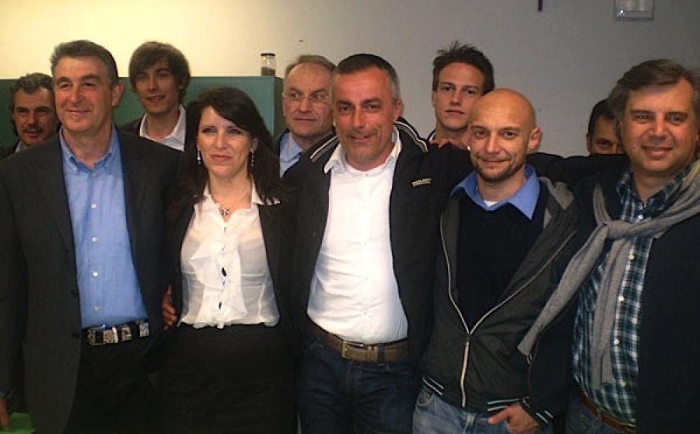 Nessun proclama o discorso ufficiale, per quelli ci sarà tempo. E' il momento degli abbracci, dei brindisi e delle foto di gruppo, compresa quella del rieletto primo cittadino con la sezione di Romano della Lega Nord.