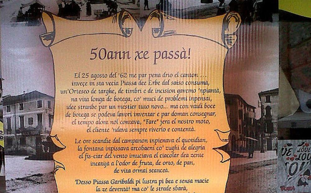 Ora in quello che ormai è l'“ex Timbrificio” in piazza restano solo alcuni articoli in vetrina che ricordano il negozio che fu e invitano a recarsi nel punto vendita appena inaugurato. Ma soprattutto, all'esterno del locale, è affisso un cartellone che non può passare inosservato: è stato infatti realizzato dal “grande vecchio” dell'azienda di famiglia Lino Lanzarin, fondatore della bottega nel 1962, che rende - a modo suo - uno speciale saluto alla “sua” piazza, scritto nientemeno che in versi e firmato “Lino timbro”. Una poesia di addio al centro storico, tra i ricordi del passato e le situazioni del presente, scritta davvero con il timbro del cuore: