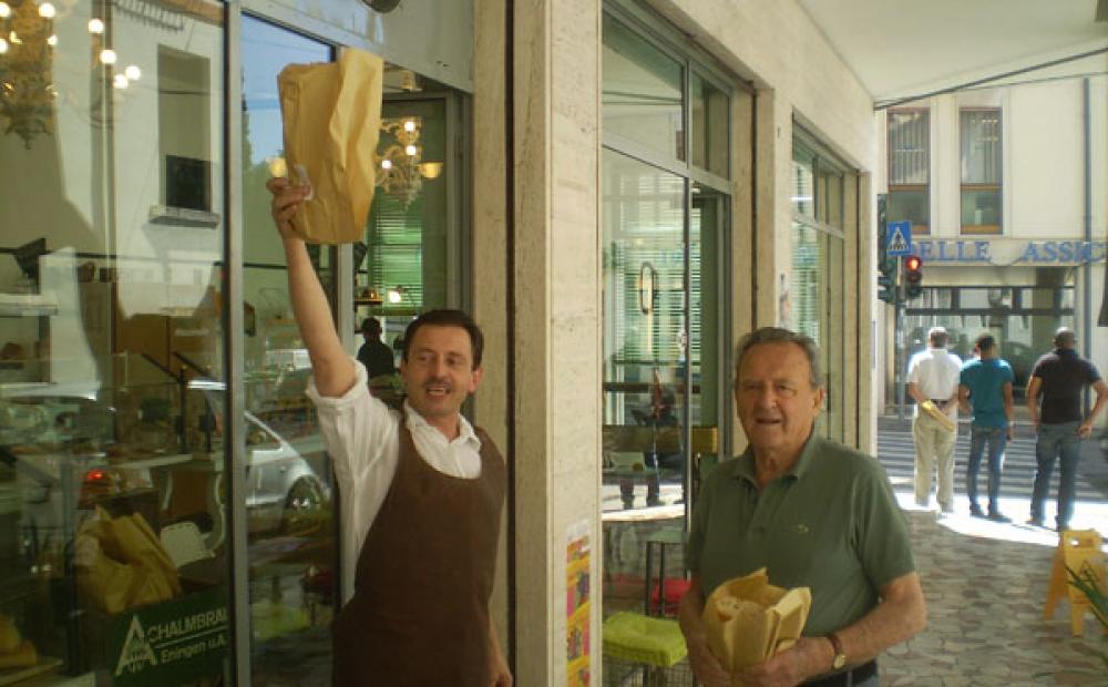Il commerciante in questione è Federico Parise, titolare della panetteria-caffetteria di vicolo Bastion in città, che questa mattina alle 11.30 è tornato fuori dall'uscio del suo negozio per proporre ai clienti di passaggio, pedoni e automobilisti fermi al semaforo, sacchetti di pane a 1 euro più regolare scontrino fiscale.