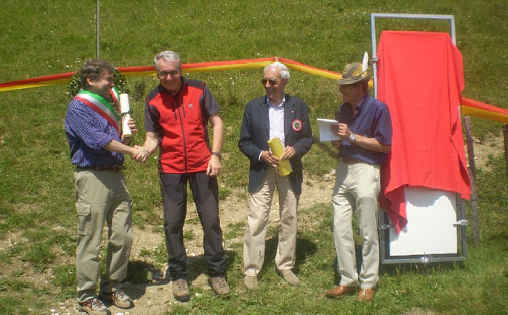 La cerimonia di consegna si svolge in una beneaugurante giornata di sole di fronte all’ampio declivio che dal tornante porta verso Val delle Foglie. Oggi questa è una verdeggiante area di pascolo e di salutari escursioni, ma quasi cento anni fa era tutt’altra cosa: uno dei punti più scoperti del fronte e più aperti ai bombardamenti nemici, tristemente noto come “giro della morte”, come testimoniano le grandi buche provocate dallo scoppio delle granate che ancora oggi, ricoperte dall’erba, contraddistinguono il paesaggio della zona.