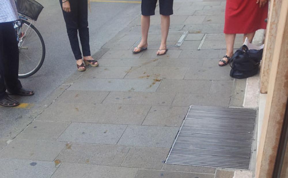 L'immagine ritrae lo stato del marciapiede che ha causato la caduta della signora, che si intravvede a destra col vestito rosso.