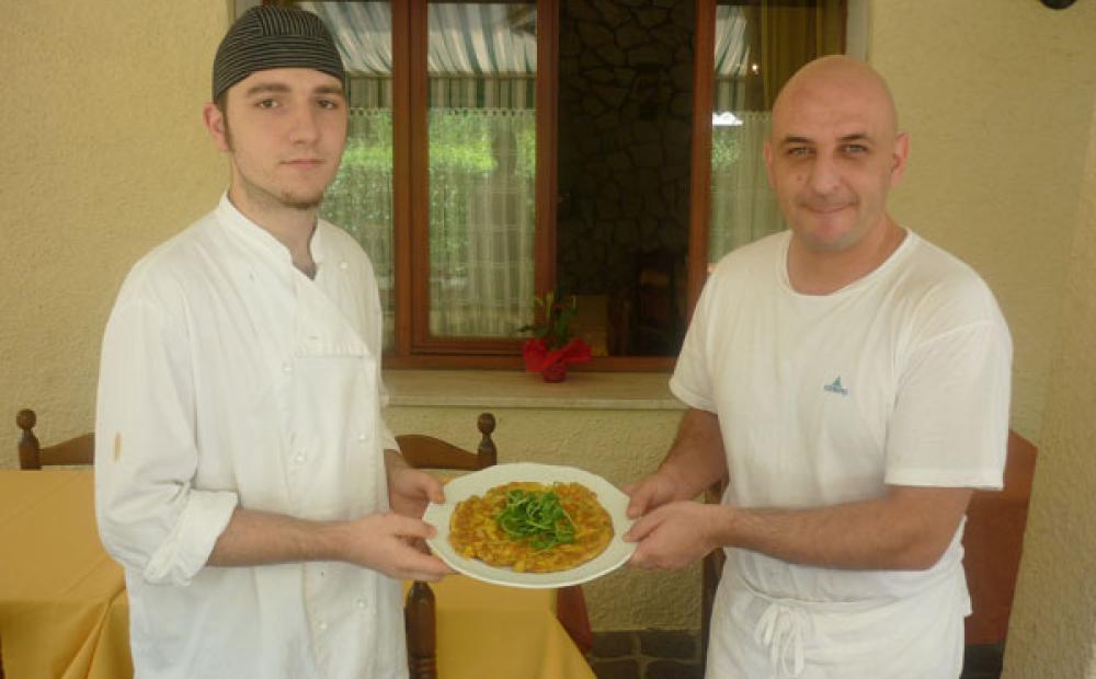 Da sinistra: Stefano Poeta, cuoco della "Mena", e lo chef Massimo Zappia servono in coppia la "Frittata con rana pescatrice" (foto Alessandro Tich)