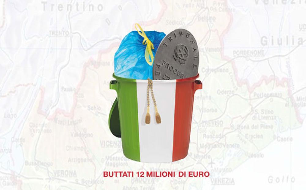 Sul manifesto c'è il solito bidone tricolore - diventato ormai il “logo” della campagna contro la chiusura del Tribunale di Bassano del Grappa -, che emerge dallo sfondo sbiadito di una cartina del Triveneto. Sopra e sotto il bidone, oltre alla scritta “Buttati 12 milioni di euro”, campeggia lo slogan “Bassano del Grappa senza Tribunale - Veneto senza Giustizia”.