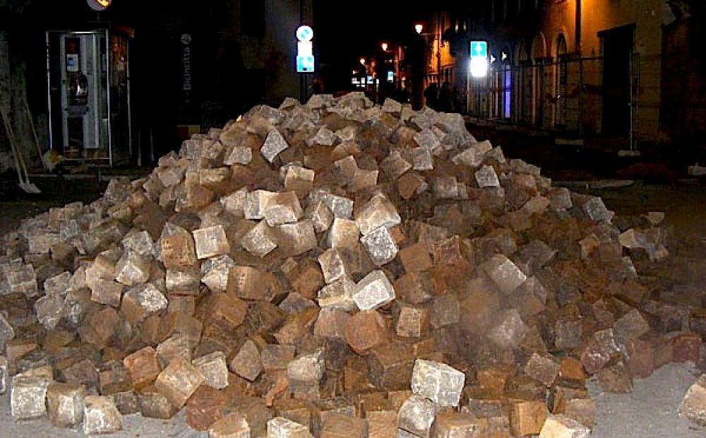 Le pietre in questione - prese a simbolo dell'oggetto del contendere - sono i cubi di porfido in fase di posa in opera per la ripavimentazione di via Angarano, una delle vie a maggiore vocazione turistica di Bassano del Grappa, e a lanciare i sassi all'indirizzo dell'Amministrazione comunale è l'assessore regionale Elena Donazzan. Che prende a cuore le rimostranze dei commercianti della via, i quali lamentano gli ostacoli causati dal cantiere nei confronti del regolare svolgimento del loro lavoro.