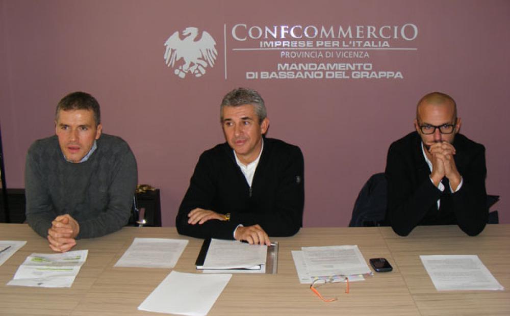 Il presidente dei commercianti di Bassano Nico Cattarin, il presidente mandamentale di Confcommercio Luca Maria Chenet e il vicepresidente dei commercianti bassanesi Filippo Mengotti all'incontro-stampa di oggi (foto Alessandro Tich)