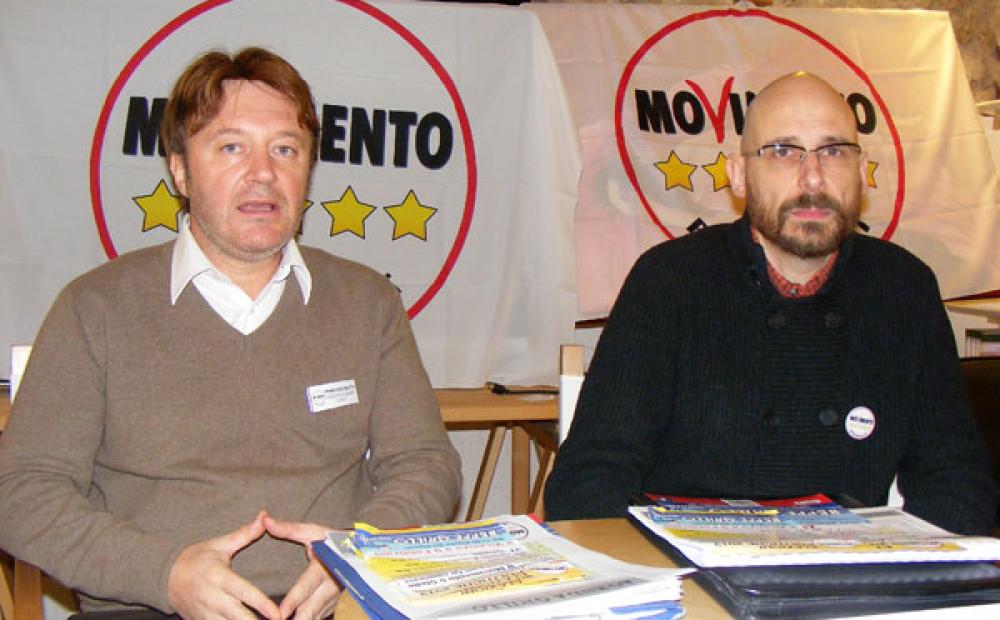 Da sinistra: Frencesco Celotto e Flavio Ferrazzi, candidati bassanesi del M5S alle politiche di febbraio (foto Alessandro Tich)