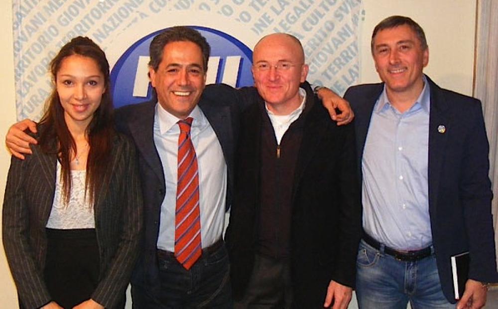 Da sinistra: i candidati di FLI alla Camera Kaoutar Badrane, Giorgio Conte, Stefano Giunta e Eros Parolin (foto Alessandro Tich)