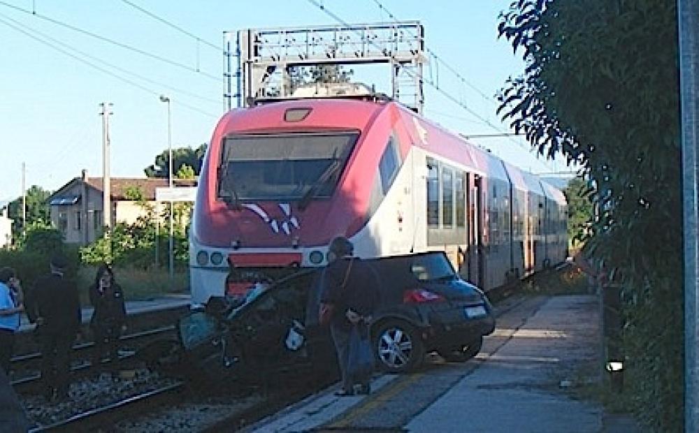 E' accaduto questa mattina nei pressi della stazione di Castello di Godego, sulla linea ferroviaria Bassano del Grappa - Venezia. Ferito il conducente dell'auto, illesi i passeggeri del convoglio partito da Bassano alle 5.58