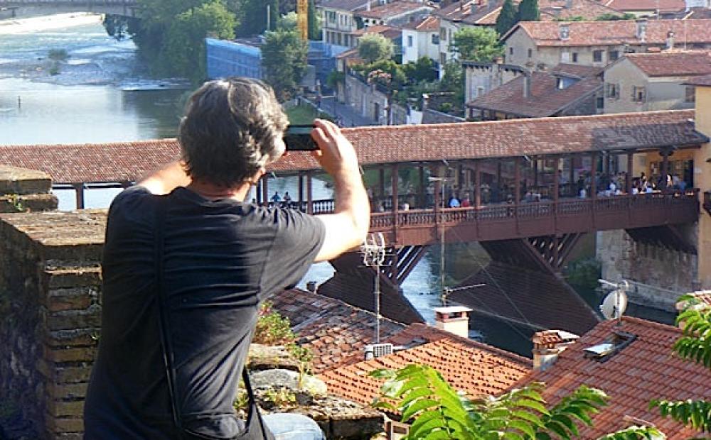Ascanio Celestini fotografa il Ponte di Bassano prima dell'"Aperitivo teatrale" di Operaestate al Castello degli Ezzelini (foto Alessandro Tich)