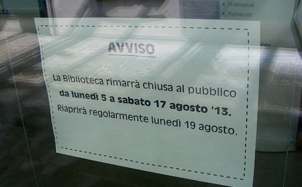Già: perché da ieri, lunedì 5 agosto e fino a sabato 17 agosto la Biblioteca è chiusa. Vamos A La Playa. Quindici giorni di ferie, considerando anche le tre domeniche comprese nel periodo. Tutti insieme contemporaneamente, anche se ufficialmente le porte del “nuovo centro culturale della città”, come ama chiamarlo l'assessore Ferraro, sono sbarrate per inventario.