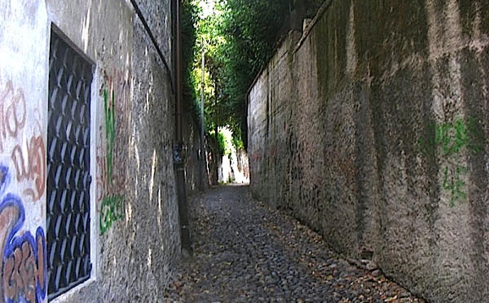 Una viuzza stretta, quasi soffocata tra due file di alti muri e il cui pavimento stradale è di un bell'acciottolato “strong”. Ma anche una viuzza dove non vige il divieto di transito (non ci sono segnali, nè cartelli di divieto) e quindi normalmente percorribile, sempre che non si conduca un mezzo di dimensioni tali da rischiare di rimanerne incastrati.