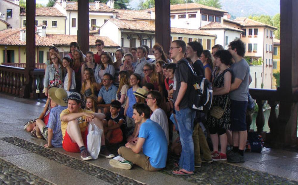 Un gruppo di turisti inglesi, musicisti dell'orchestra giovanile "The High Peak String" che si esibisce questa sera ad Asiago, oggi sul Ponte di Bassano (foto Alessandro Tich)