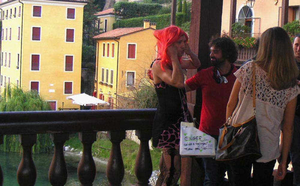 Sul lato opposto del Ponte si sta “preparando” un secondo capannello: in mezzo al gruppo noto una ragazza col velo da sposa e soprattutto un ragazzo travestito da baldracca, parrucca rossa e borsetta con la scritta “Ginger...calda e vogliosa tutta per voi!!!”.
