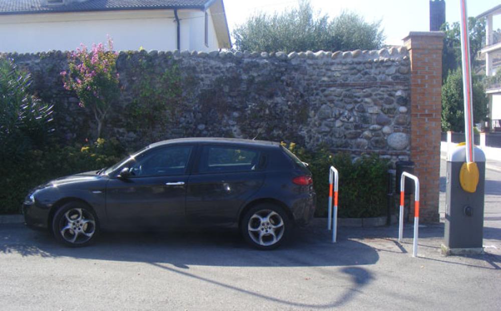 Ma ecco che, mentre mi apprestavo ad uscire dal posteggio, è arrivata un'auto il cui conducente, pur vedendo l'ampia disponibilità di parcheggi, si è fermato proprio accanto all'uscita e ha fatto manovra per lasciare la vettura - come vedete nella nostra foto - in area non consentita, attaccata al muretto e al paletto di delimitazione, a un metro dall'uscita medesima.