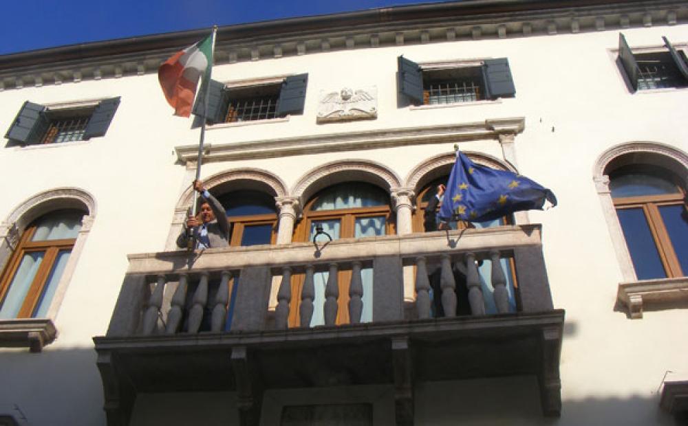 Le due bandiere della Procura di Bassano vengono tolte e ammainate: si chiude (foto Alessandro Tich)