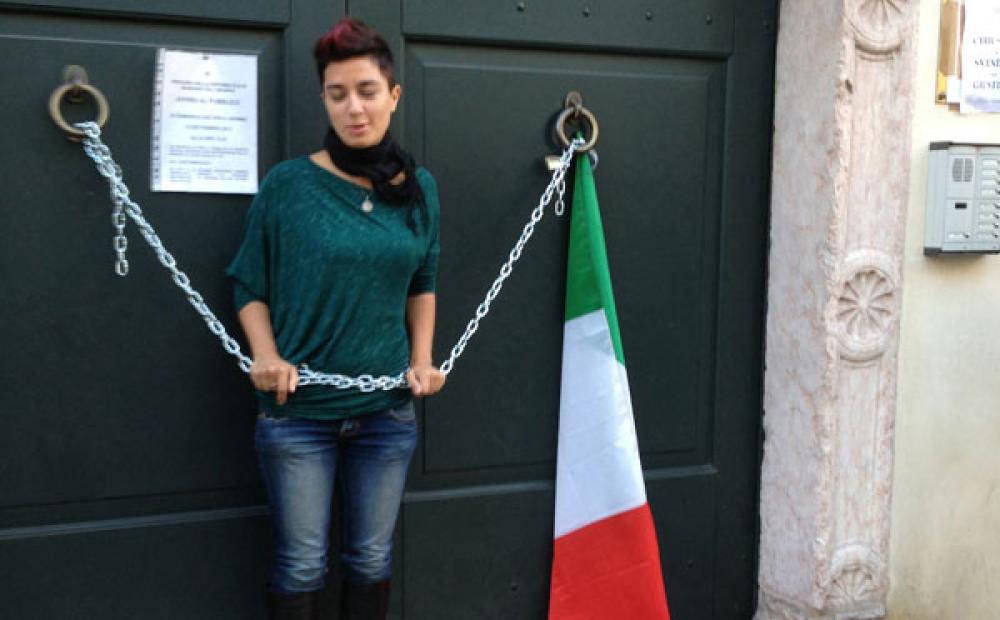 La consigliera di Bassano ConGiunta Ilaria Brunelli incatenata all'ingresso dell'ex Procura di Bassano