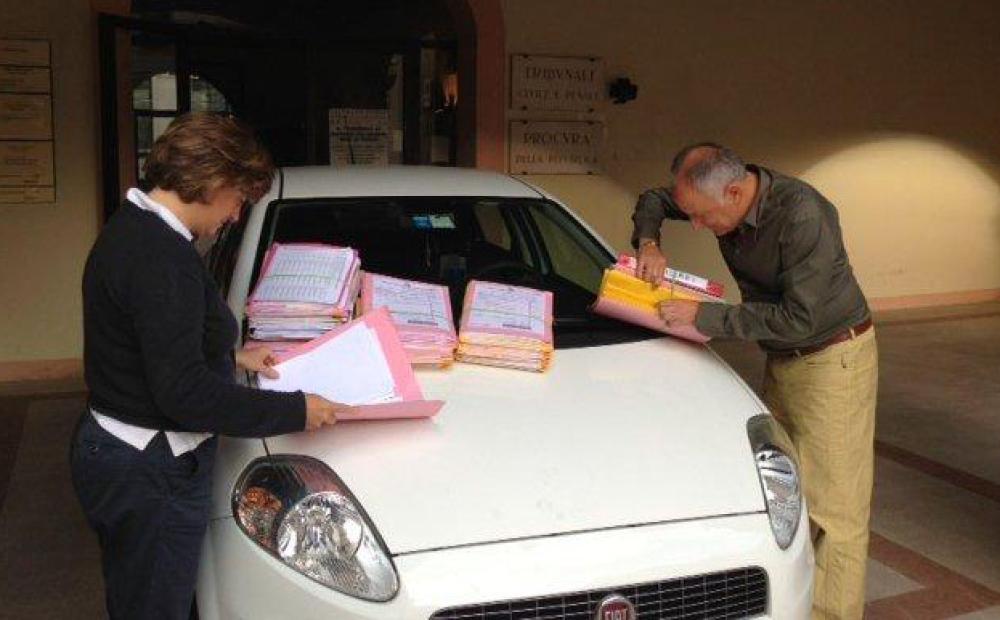 Bassano: il Giudice Avv. Sara Gregoris ed il Cancelliere controllano uno ad uno gli 89 fascicoli dell’udienza odierna (si veda foto). Con l’auto di servizio del Tribunale di Bassano i fascicoli partono verso il Tribunale di Vicenza per l’udienza fissata alle 9.00; non si sa ancora se ci sarà un’aula disponibile e se l’udienza si potrà tenere.