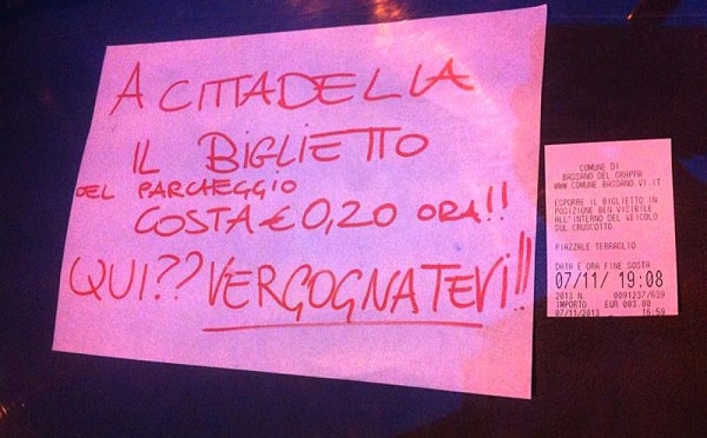Ma c'è anche chi, come l'automobilista da fuori Bassano che nel tardo pomeriggio di oggi ha parcheggiato la sua vettura in piazzale Terraglio, pagando 3 euro per poco più di due ore di sosta, a fianco del ticket dietro il parabrezza ha messo bene in vista anche qualcos'altro.