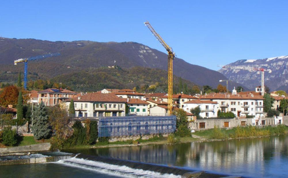 Cartolina di Bassano: città del Ponte, del Brenta e dei panorami mozzafiato. Ma a svettare, sullo skyline della città, sono le gru. Tra cui quelle di tre particolari cantieri edili in Angarano: Albergo Cavalletto, Palazzo Jonoch e l'ex Macello