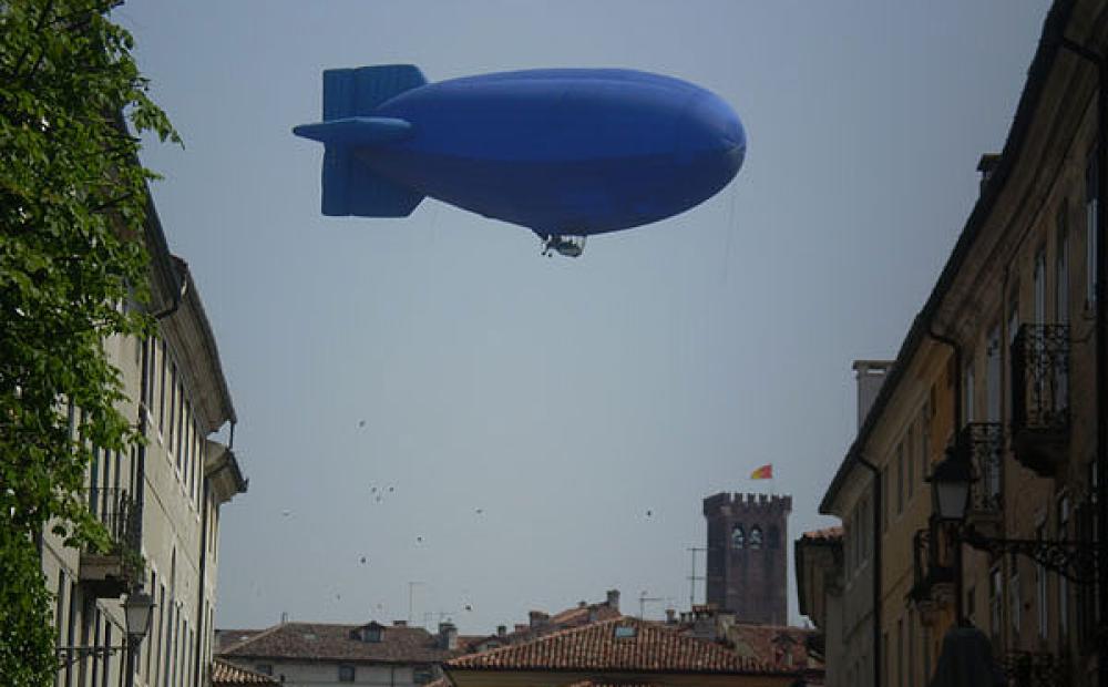 15 aprile 2009: il dirigibile blu in volo contro il progetto previsto nell'Area Parolini (foto Alessandro Tich - archivio Bassanonet)