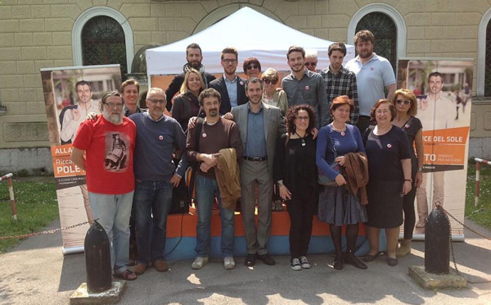 Il candidato sindaco del centrosinistra Riccardo Poletto con un gruppo di candidati della sua coalizione davanti alla Caserma Montegrappa