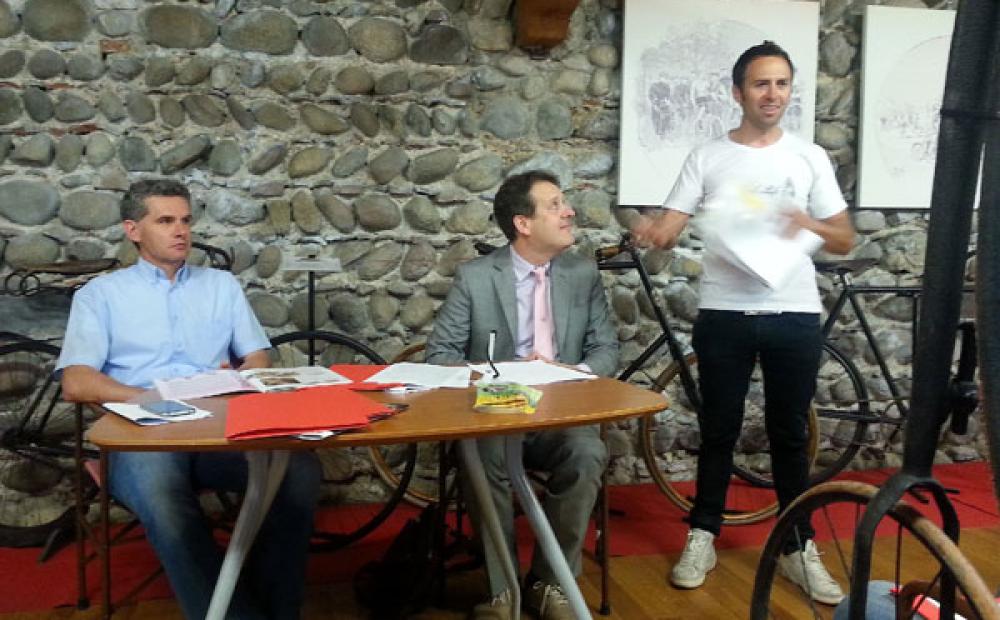 Il presidente del Comitato Tappa di Crespano Giorgio Andreatta, il presidente del Comitato Tappa di Bassano Nazzareno Leonardi e Gilberto "Gibo" Simoni alla conferenza stampa in sala Iat