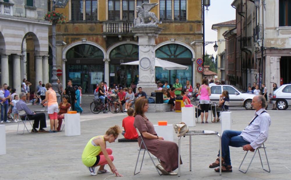 Tavolini in piazza Libertà per la performance di @polis (foto Alessandro Tich)